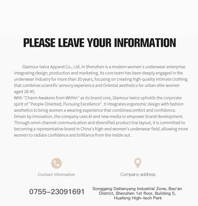 Glamour twice Apparel Co., Ltd. in Shenzhen is a modern women's underwear enterprise integrating design, production and marketing. Its core team has been deeply engaged in the underwear industry for more than 20 years, focusing on creating high-quality intimate clothing that combines scientific sensory experience and Oriental aesthetics for urban elite women aged 28-45.